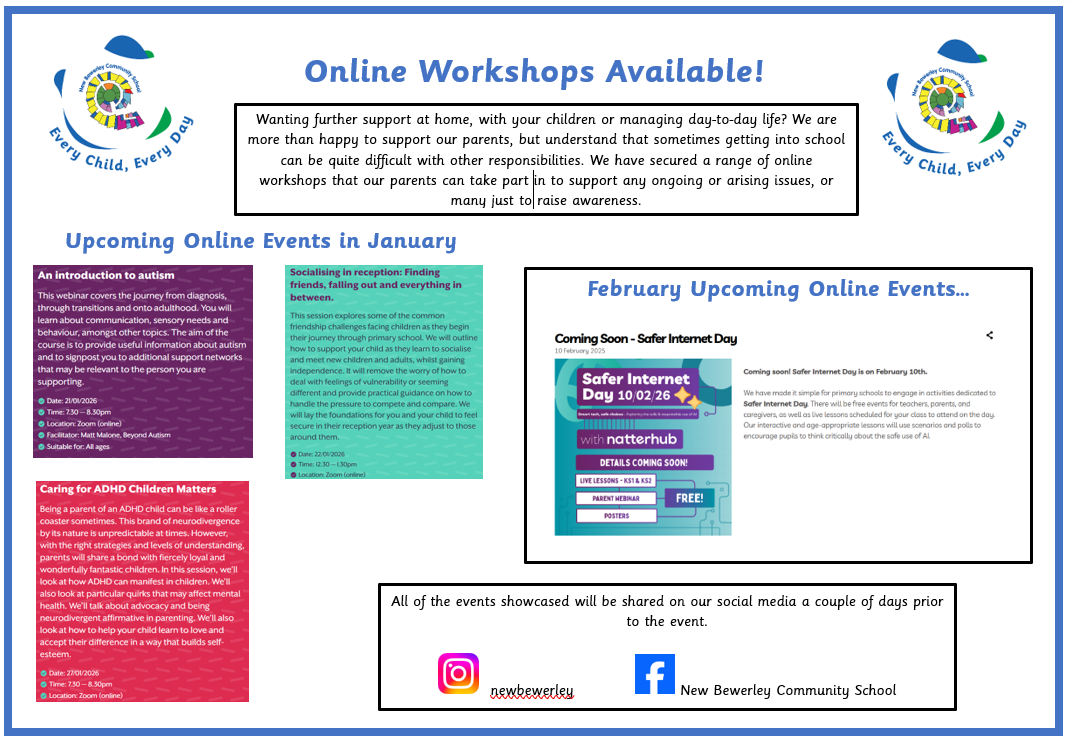 We also use a range of external support for online workshops. We understand that it can be difficult to attend workshops during the day, so have sought others which can provide information to support at home. Please see the information below for upcoming workshops. All will be advertised on our social media, a couple of days prior to the event.